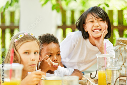 Multicultural group of children having breakfast together