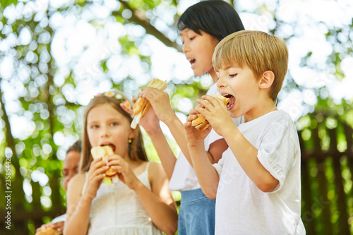 Kinder essen leckere Baguette Brötchen