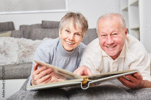 Paar Senioren mit Alzheimer betrachtet Fotoalbum