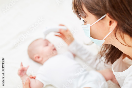 Ärztin mit Mundschutz misst Fieber bei Baby