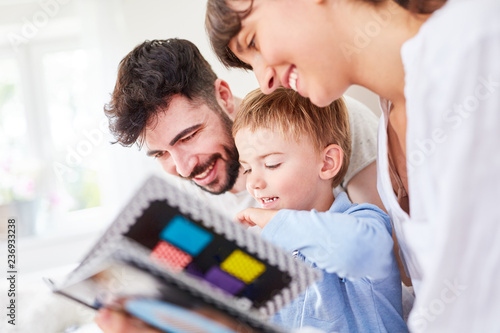 Familie schaut Fotoalbum oder Bilderbuch mit Sohn