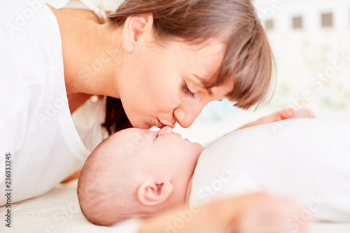 Mutter gibt ihrem Baby einen Kuss auf die Stirn