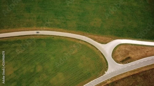 Birds eye tracking shot of tractor leaving field and encountering traffic