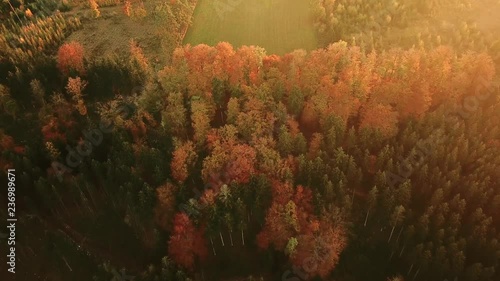 Aerial tilt shot of fall forest landscape during sunset