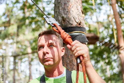 Junge Leute helfen sich beim Klettern im Hochseilgarten