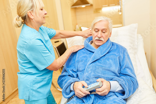 Pflegekraft mit Fernbedienung am Pflegebett