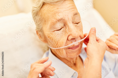 Seniorin mit Nasensonde oder Sauerstoffbrille