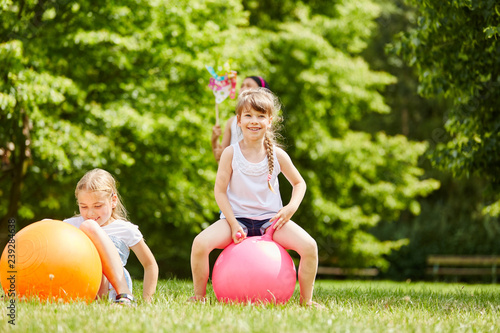Mädchen hüpft bei Hüpfspiel im Sommer