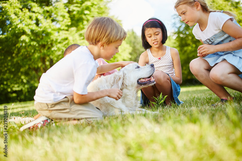 Familie mit zwei Kindern beim Hund streicheln