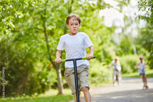 Children drive scooters in the park
