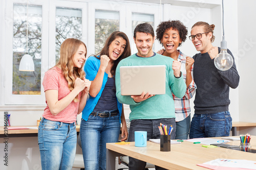 Start-Up Team mit Laptop jubelt über einen Erfolg