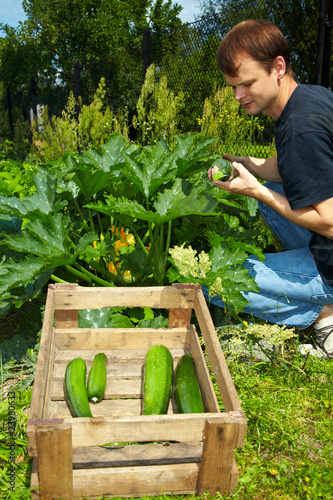 Farmer putting vegetables in crate in greenhouse