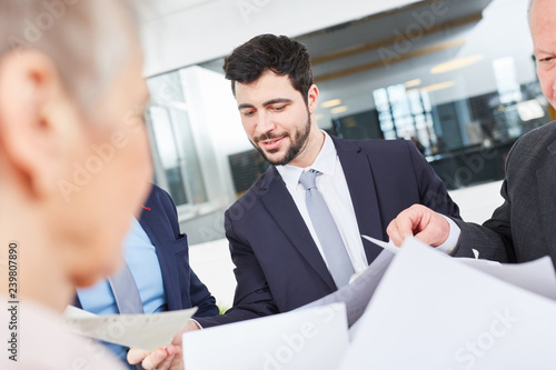 Silhouetten von Geschäftsleuten vor Collage aus vielen Mitarbeiter Portraits