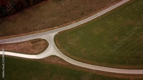 Large truck driving on rural road at sunset followed by cars on a scenic country highway