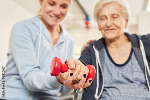 Therapeutin unterstützt Senior Frau beim Hanteltraining