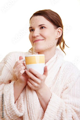 Frau im Bademantel mit Kaffeetasse