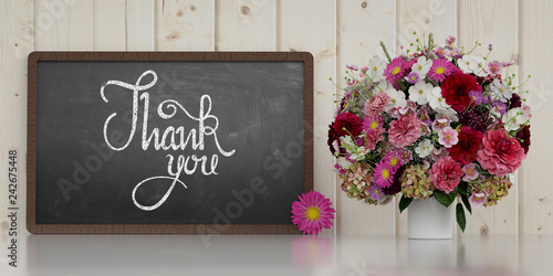 Happy Birthday Text auf Tafel neben Blumenstrauß