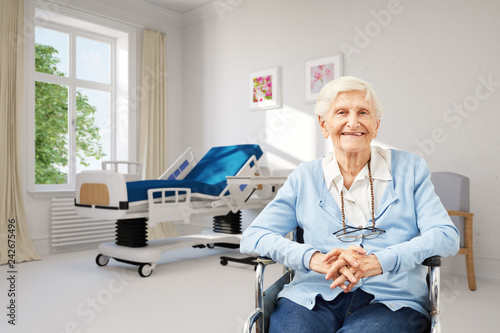Seniorin im Rollstuhl vor Bett im Pflegeheim