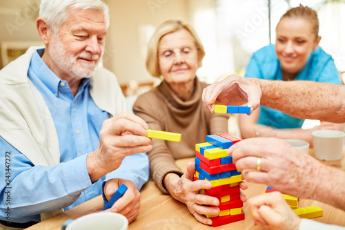 Gruppe Senioren spielt mit Bausteinen im Altenheim
