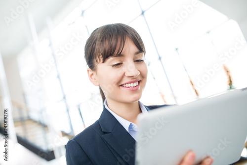 Erfolgreiche Geschäftsfrau nutzt einen Tablet Computer