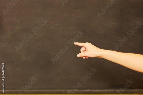 Hand einer Lehrerin zeigt auf eine leere Tafel
