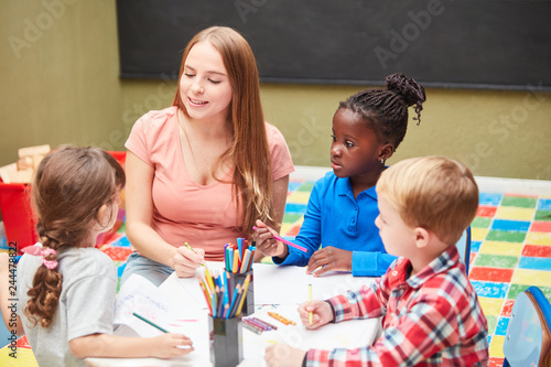 Erzieherin und Kinder im Kunstunterricht
