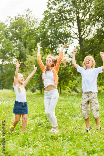 Mutter und Kinder jubeln zusammen im Garten