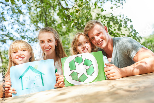 Familie mit Zeichnung vom Traumhaus und Logo