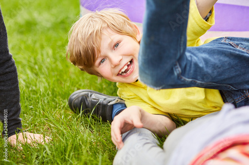 Gruppe Kinder liegt im Kreis auf einer Wiese