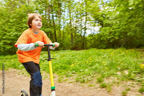Kinder machen Wettrennen mit Roller und Fahrrad