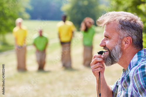 Schiedsrichter kurz vor dem Start beim Sackhüpfen
