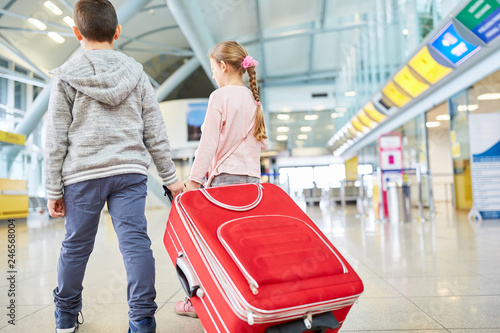 Zwei Kinder mit Gepäck im Flughafen Terminal