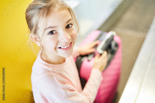 Kleines Mädchen als Passagier mit Koffer am Check-In