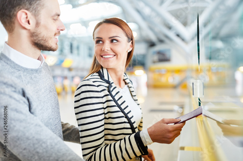 Junges Paar mit Reisepass am Check-In Schalter