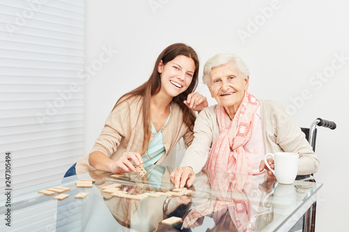 Krankenschwester mit einer alten Frau im Rollstuhl