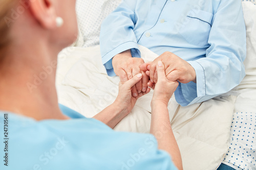 Fürsorgliche Pflegekraft hält die Hände eines kranken Senioren als Sterbebegleitung