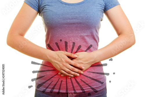 Frau mit Bauchschmerzen hält Hände auf Bauch