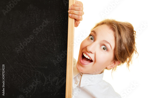 Frau schaut lachend hinter Kreidetafel Hintergrund hervor
