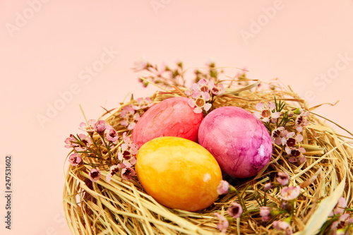 Bunte Ostereier im Nest als Dekoration zu Ostern