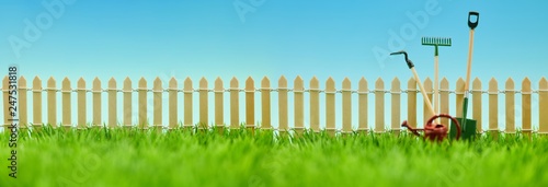 Garten mit Zaun und Gartenarbeit Werkzeug