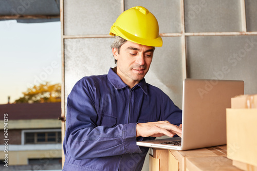 Bauarbeiter als Vorarbeiter schaut auf Tablet Computer