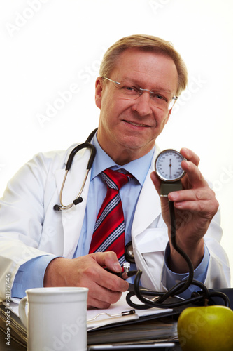 Arzt zeigt Blutdruckmessgerät
