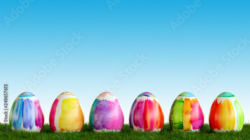 Many colorful Easter eggs painted with watercolors on meadow for Easter