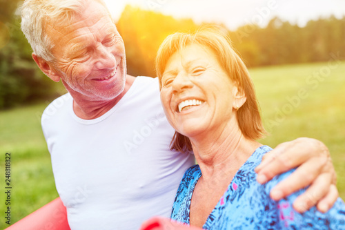 Lachende Senioren begrüßen sich im Sommer
