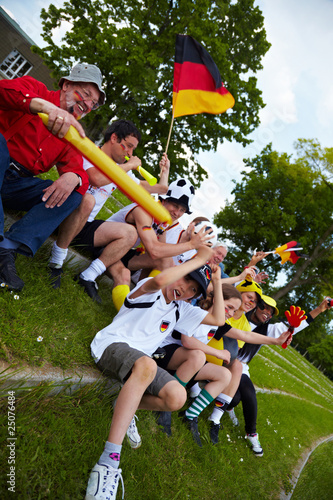 Gruppe Freunde beim Jubeln und Springen in der Natur