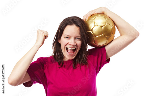 Jubelnde Frau mit Fußball