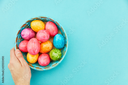 Hand hält Korb mit Ostereier zu Ostern