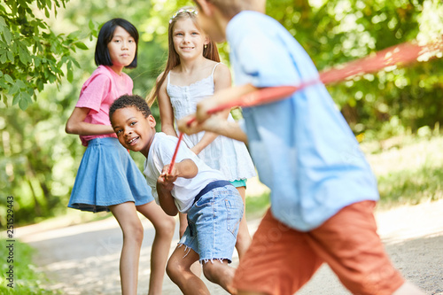 Children in tug of war as a strong team
