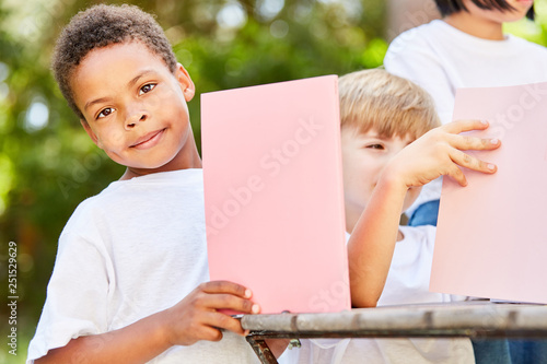 Multikulturelle Gruppe Kinder hält Weltkugel