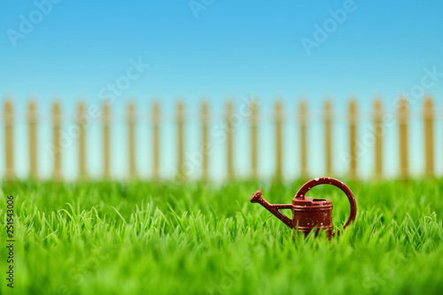 Grüne Wiese im Garten mit Gras Rasen vor Zaun